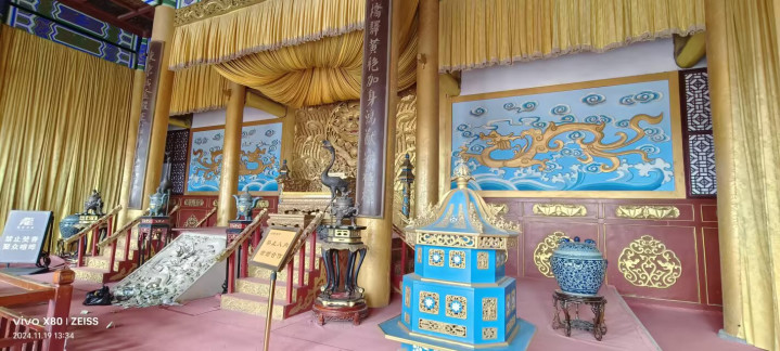 自午门至大殿,是一条长480米的御谈。这条御谈宛如一条丝线,将玉带桥、嵩呼、朝门等景致精巧地皆集其中。御谈两侧,就是申明远扬的杨家湖与潘家湖也就是午门楹联上说的清浊寓善恶的两湖。