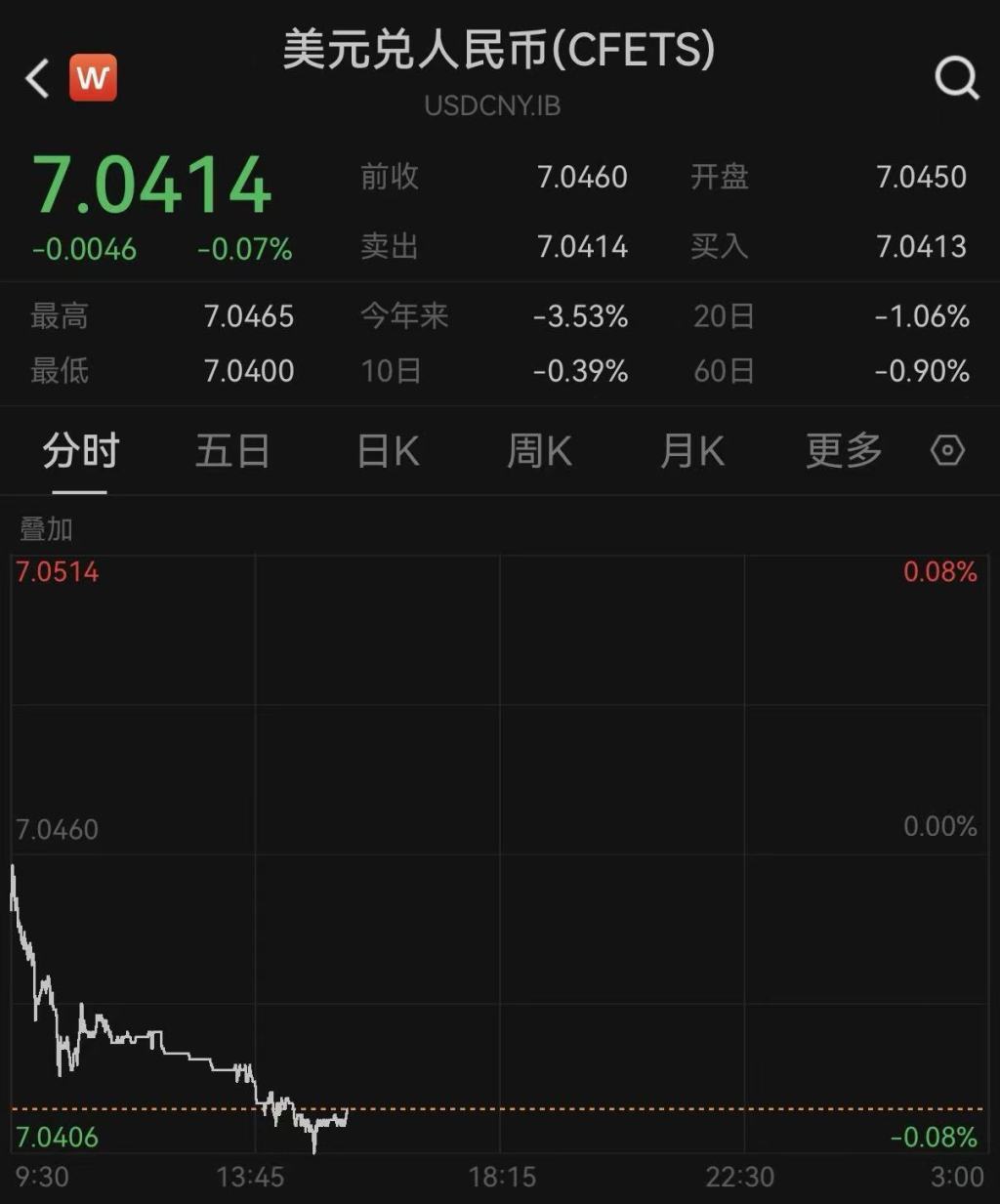 12月18日,东说念主民币对好意思元即期汇率开盘报7.0450,盘中最高升至7.0400,冲突前期高点(12月16日盘中最高升至7.0410),创下2024年10月以来的14个多月新高。