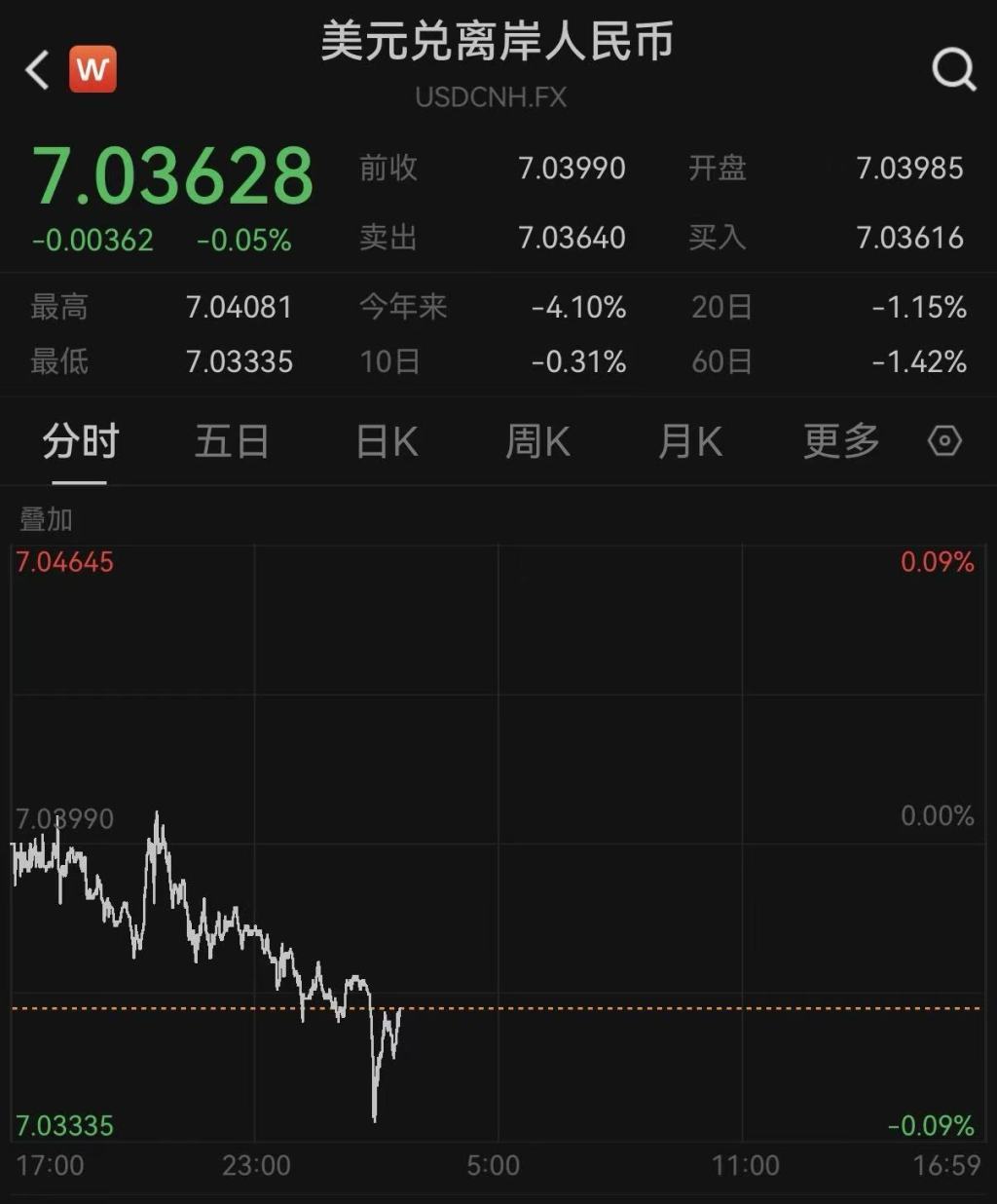 离岸阛阓上,为止发稿,更多反馈外洋投资者预期的离岸东说念主民币对好意思元汇率盘中最高升至7.03335,较前一往将来7.0399的收盘价小幅走高。