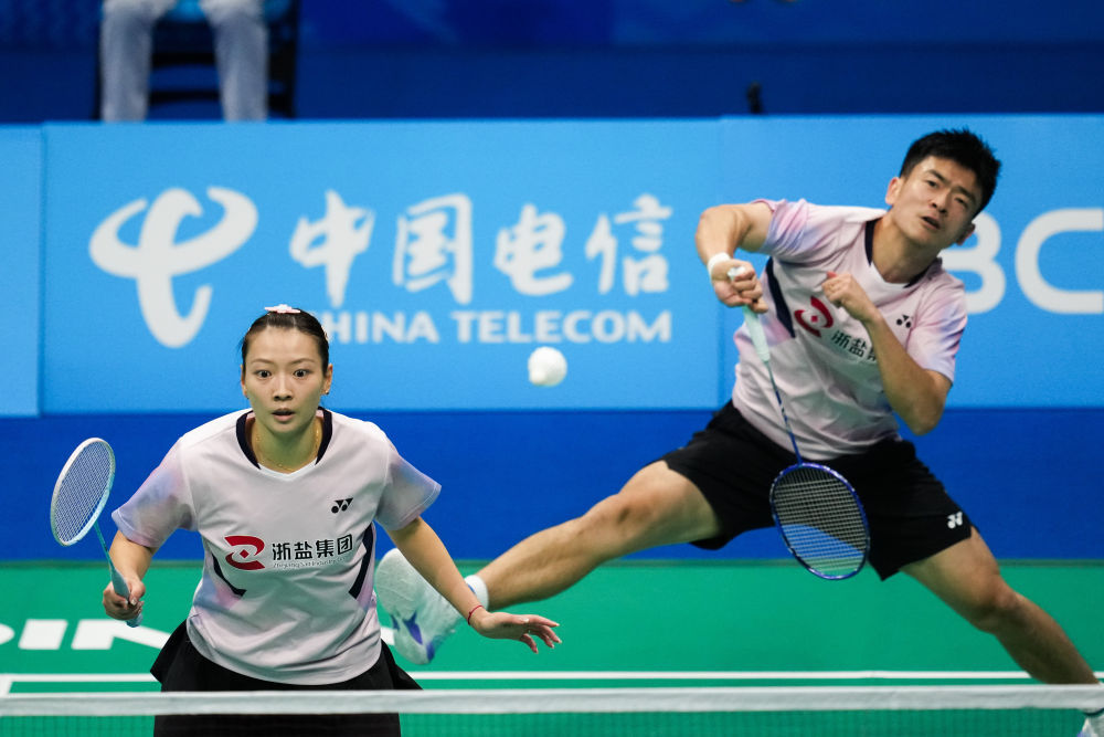 11月20日,浙江队组合郑念念维(右)/黄雅琼在全运会混双决赛中。新华社记者 陈念念汗 摄