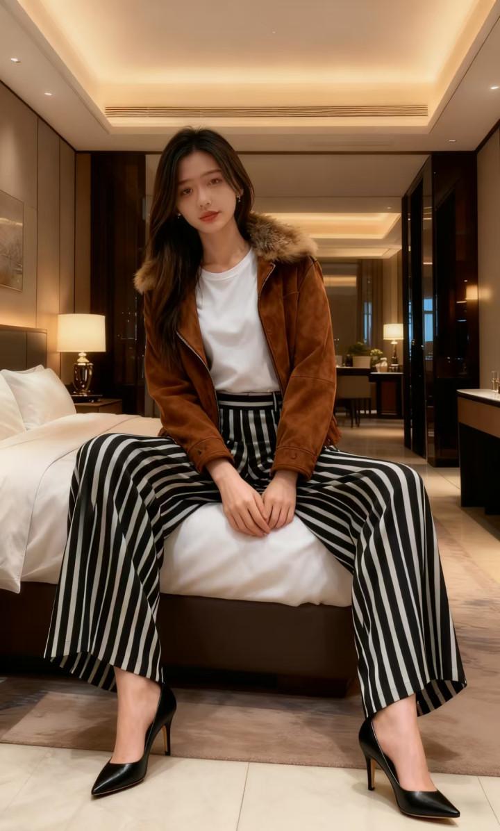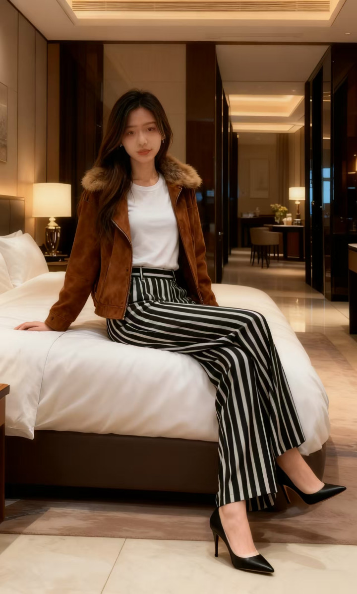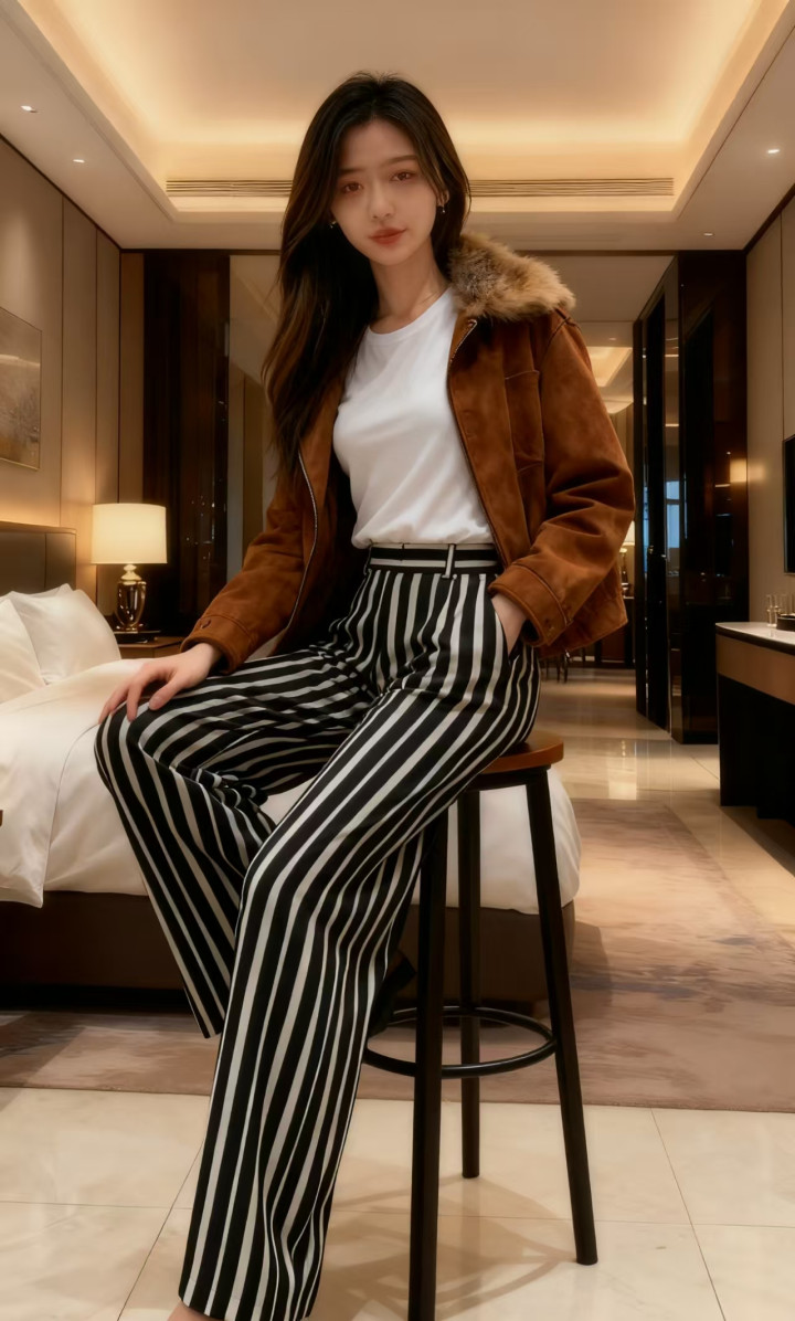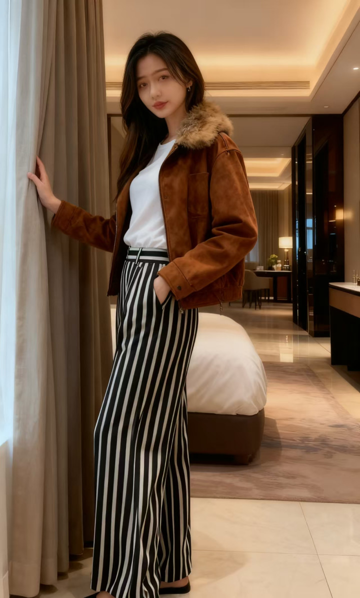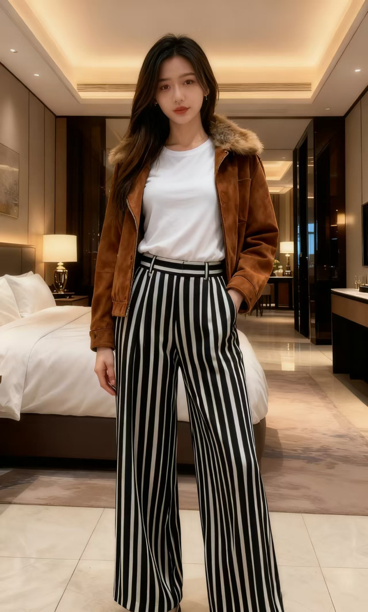 下装诟谇竖纹高腰阔腿裤,竖条纹的野心拉长腿部线条,冲破了纯色的单调。